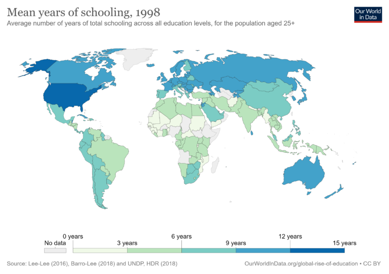 The increase in the number of years of schooling over the 1998-2017 time frame is most noticeable in sub-Saharan Africa. While data was not available for more than a dozen African nations in 1998, virtually all increased the number of mean schooling years. Similar results are evident for India, Southeast Asia and Latin and South American nations.